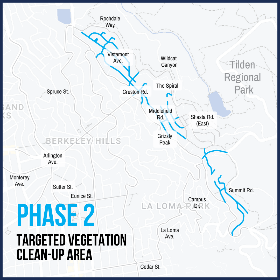Work in Berkeley includes treatments along the roadways that serve as emergency access/egress to the upper parts of Grizzly Peak Blvd during a fire and provide multiple options for evacuation routes. It will remove combustible/hazardous vegetation in the public right of way within 10 feet of roadways.